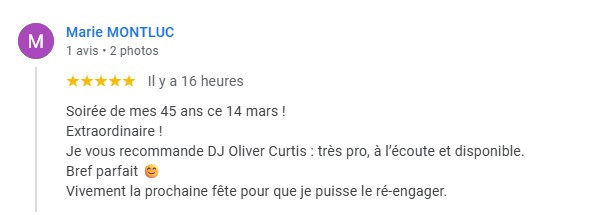 On a fait appel à Oliver Curtis pour notre mariage, et on n’aurait pas pu rêver mieux. Il a mis une super ambiance, tout le monde a dansé du début à la fin. Très pro, à l’écoute, et vraiment doué pour lire la salle. Merci pour cette soirée inoubliable !